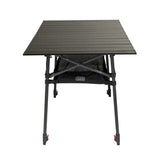The ARB Pinnacle Camp Table is perfect for cooking and eating on the move. Its durable frame is made from black aluminum with contrasting charcoal crossbars. The generously sized, black, rugged tabletop provides ample space for mealtime or game night. Each leg can be independently adjusted to allow for stability on uneven surfaces, and the table height can be adjusted anywhere from 31 to 39 inches. The built-in brackets on the frame hold the included mesh basket for added storage. The table packs into a compact 600D polyester carry bag featuring a built-in internal divider to separate the tabletop from the frame.